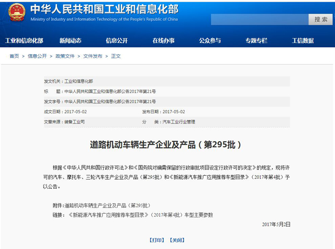 根據(jù)《中華人民共和國行政許可法》和《國務(wù)院對確需保留的行政審批項目設(shè)定行政許可的決定》的規(guī)定,現(xiàn)將許可的汽車、摩托車、三輪汽車生產(chǎn)企業(yè)及產(chǎn)品(第295批)和《新能源汽車推廣應(yīng)用推薦車型目錄》(2017年第4批)予以公告。