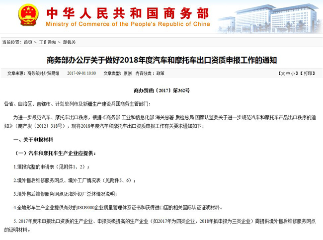 為進(jìn)一步規(guī)范汽車、摩托車出口秩序,根據(jù)《商務(wù)部 工業(yè)和信息化部 海關(guān)總署 質(zhì)檢總局 國家認(rèn)監(jiān)委關(guān)于進(jìn)一步規(guī)范汽車和摩托車產(chǎn)品出口秩序的通知》(商產(chǎn)發(fā)〔2012〕318號(hào)),現(xiàn)將2018年度汽車和摩托車出口資質(zhì)申報(bào)工作有關(guān)要求通知如下: