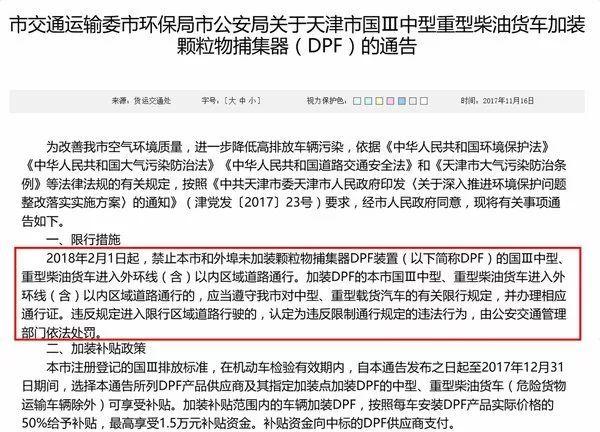 天津市要求國三柴油貨車加裝DPF才能進(jìn)外環(huán),山東省要求國三貨車加裝DPF;除此之外,深圳、北京等都相繼出臺了國五車必須要加裝DPF才能上牌的規(guī)定。