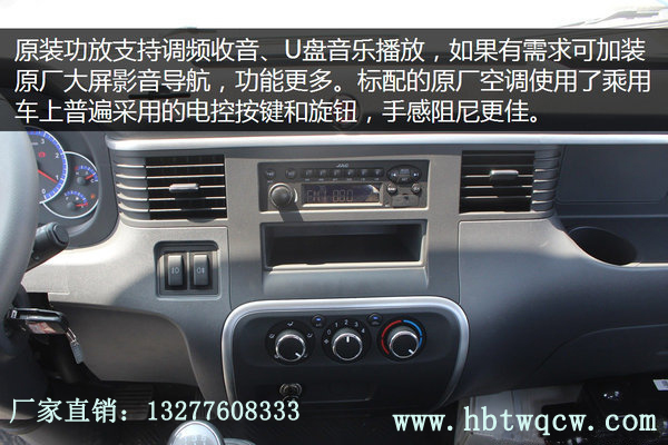 江淮駿鈴V5底盤型號HFC1045P92K2C2ZV,1900mm豪華寬體駕駛室,軸距3308mm,江淮五十鈴HFC4DA1-2D發(fā)動機120馬力,7.00R16LT 8PR鋼絲胎,ABS,電動門窗,中控鎖,原廠空調(diào),多功能方向盤,LED大燈。