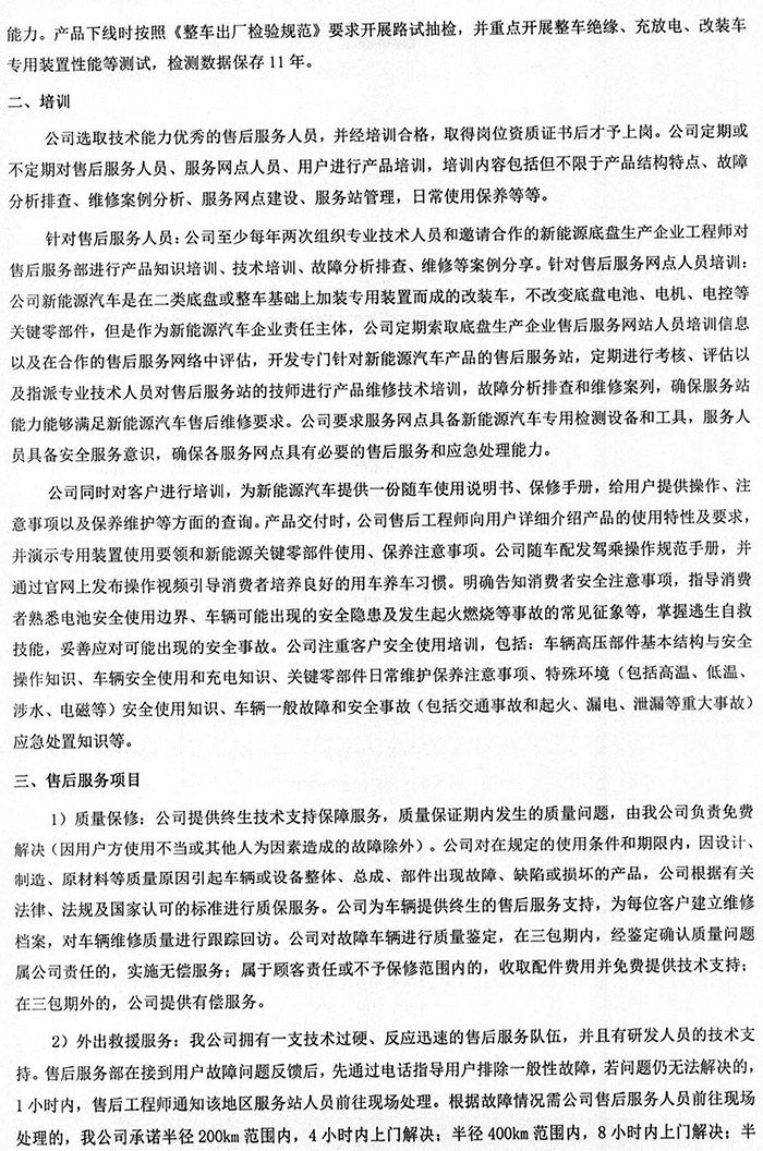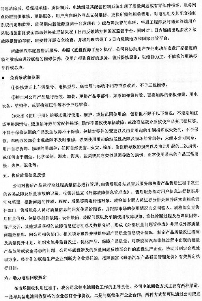 在用戶嚴(yán)格遵循使用說明書,正常操作的情況下,自購車之日起(以車輛出廠登記卡為準(zhǔn))一年內(nèi),行駛里程不超過 25000公里之內(nèi),因設(shè)計(jì)、制造、裝配原因引起的產(chǎn)品機(jī)件損壞,經(jīng)有關(guān)汽車服務(wù)站和監(jiān)督部門鑒定后,在三個工作日內(nèi)向我公司售后服務(wù)部門提交書面資料,售后服務(wù)部門確認(rèn)后實(shí)行三包服務(wù)。