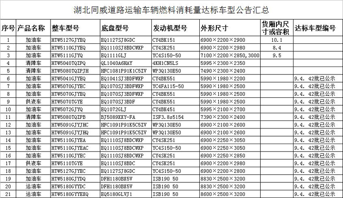湖北同威道路運輸車輛燃料消耗量達標車型公告匯總