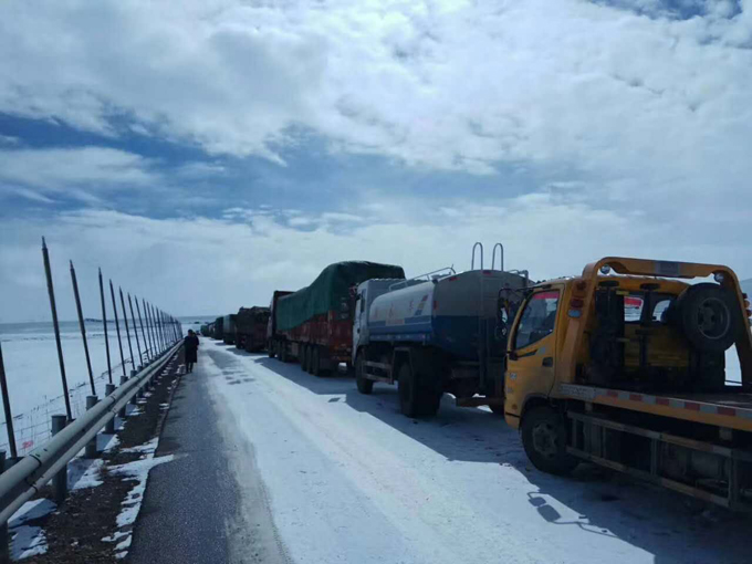 10月30日,司機(jī)抵達(dá)格爾木,繼續(xù)往前進(jìn)入唐古拉山。青藏線唐古拉段因?yàn)橄麓笱,目前造成路邊結(jié)冰。由于道路狹窄,數(shù)百輛卡車被堵在路上,情況緊急。由于唐古拉段海拔高,氣溫低,卡車司機(jī)只能使用車輛只有的暖風(fēng)系統(tǒng)進(jìn)行取暖。但是由于堵車時(shí)間長(zhǎng),部分車輛已經(jīng)出現(xiàn)柴油不足的情況。部分司機(jī)車內(nèi)已經(jīng)沒(méi)有食物,更有甚者出現(xiàn)無(wú)法取暖的情況,據(jù)卡友透露,已經(jīng)有部分司機(jī)出現(xiàn)高反,情況十分危急。