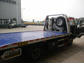 該車平板長(zhǎng)度為5.6米,寬2.3米。平板采用模具沖壓式凸紋板分塊組合,在裝載輪胎壓滾面域,噴附防滑 顆粒狀物質(zhì),磨擦系數(shù)增大,較一般平板約增大2~3倍的磨擦附著力。平臺(tái)總成采用 新一次性壓制成型制作,加強(qiáng)型槽鋼橫梁固定、既減輕了整車重量,又增加了托舉和裝載能力,還增加了平臺(tái)裝載面的防滑功能,即美觀又實(shí)用。