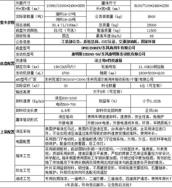 | 罐體外形尺寸:8000×2450×2250(mm),罐體有效容積:27.93立方米隨底盤選裝駕駛室;外形長(mm)/軸距(mm)/后懸(mm)/離去角(°)對(duì)應(yīng)關(guān)系為”:10990/1800+5000/2760/11,10000/1800+4100/2670/12;防護(hù)材料:Q235,連接方式:側(cè)后防護(hù)均采用焊接連接,后部防護(hù)斷面尺寸(mm):120×60,后部防護(hù)離地高度(mm):450。安裝帶衛(wèi)星定位功能的行駛記錄儀。ABS生產(chǎn)廠家:東科克諾爾商用車制動(dòng)系統(tǒng)(十堰)有限公司;型號(hào):3631010-C2000.;發(fā)動(dòng)機(jī)與油耗值的對(duì)應(yīng)關(guān)系分別為:ISD210 50/33.7(L/100Km),ISD245 50/33.6(L/100Km),ISD210 50/33.7(L/100Km),ISD270 50/33.6(L/100Km),ISD285 50/33.5(L/100Km)。該車專用裝置為絞龍,飼料倉,用于運(yùn)輸散裝飼料,自卸方式:絞龍?zhí)嵘孕。選裝后部樣式。 |