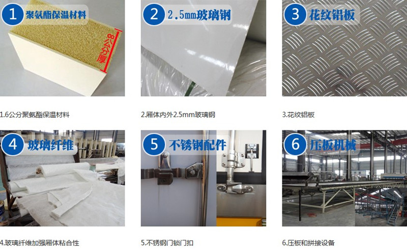 配件:廂體周邊2.5mm鋁合金包邊,不銹鋼包角,不銹鋼門鎖,防碰膠皮4塊,不銹鋼門框, 不銹鋼合頁(yè),箱內(nèi)節(jié)能照明燈;廂體厚度可選100mm、120mm,內(nèi)外壁板可選裝玻璃鋼、彩鋼板、不銹鋼、鋁合金。