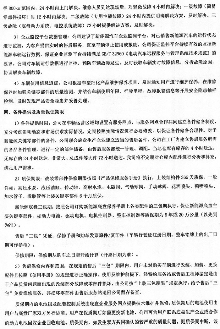 在用戶嚴(yán)格遵循使用說明書,正常操作的情況下,自購車之日起(以車輛出廠登記卡為準(zhǔn))一年內(nèi),行駛里程不超過 25000公里之內(nèi),因設(shè)計(jì)、制造、裝配原因引起的產(chǎn)品機(jī)件損壞,經(jīng)有關(guān)汽車服務(wù)站和監(jiān)督部門鑒定后,在三個工作日內(nèi)向我公司售后服務(wù)部門提交書面資料,售后服務(wù)部門確認(rèn)后實(shí)行三包服務(wù)。