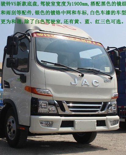 江淮駿鈴V5底盤型號HFC1045P92K2C2ZV,1900mm豪華寬體駕駛室,軸距3308mm,江淮五十鈴HFC4DA1-2D發(fā)動機120馬力,7.00R16LT 8PR鋼絲胎,ABS,電動門窗,中控鎖,原廠空調(diào),多功能方向盤,LED大燈。